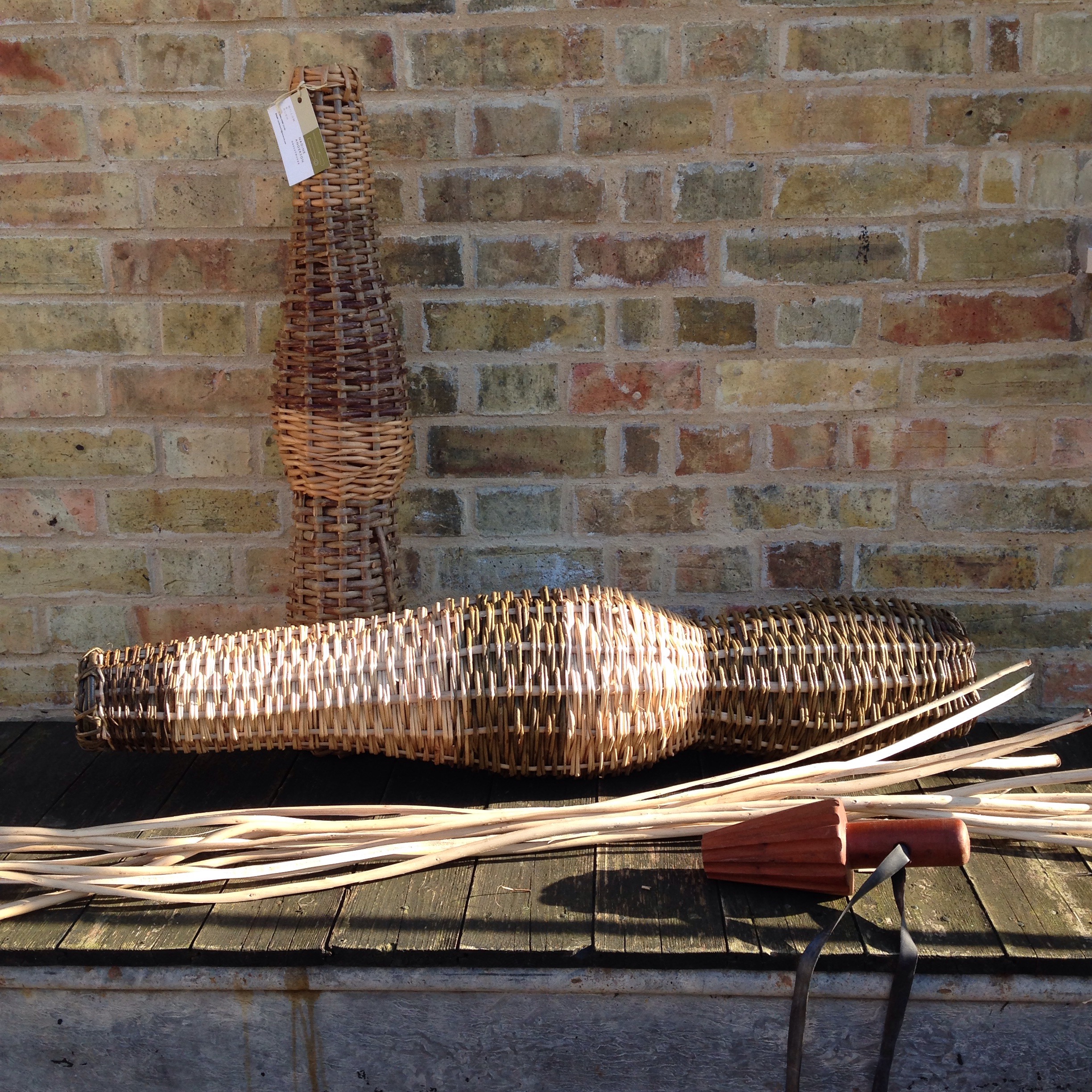 Eel traps/hives, cleaved and shaved 7-8 foot rods that form main structure uprights and wood turned Yew former.The horizontal hive was a commission for a customer who visited my Open Studio in July,who is very knowledgable on Ely local history.