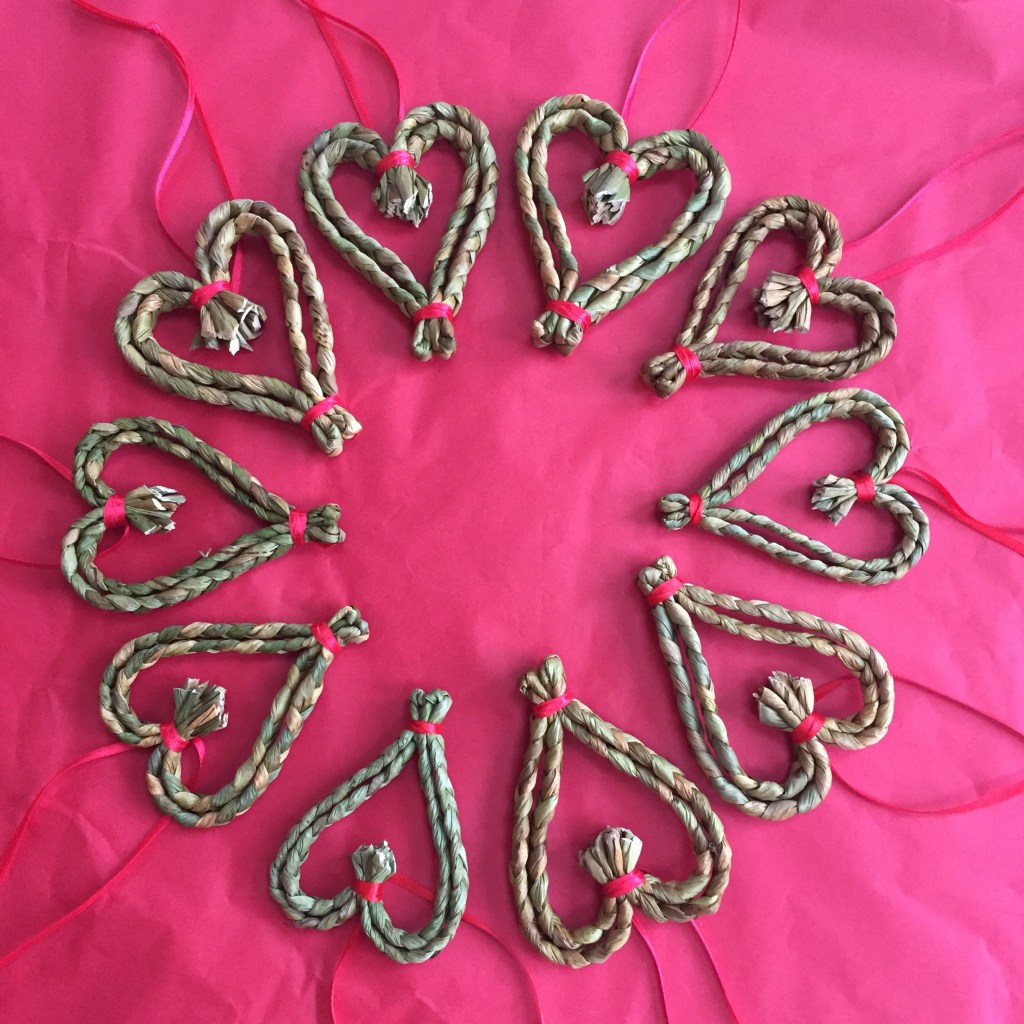 Rush Heart Love Tokens Small £6, Large £12 Small 10cm x 8cm, Large 21cm x 18cm Plaited fine or coarse Cambridgeshire Rushes tied with raffia, linen, hemp or ribbon to make a love token based on a traditional Corn Dolly. Lovely to gift at any time of the year but particularly at Valentines, Christmas, Birthdays or Christenings, and often used as wedding favours.