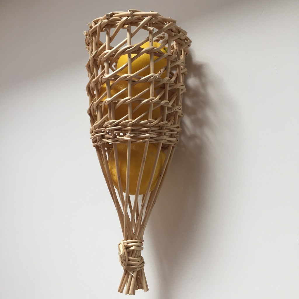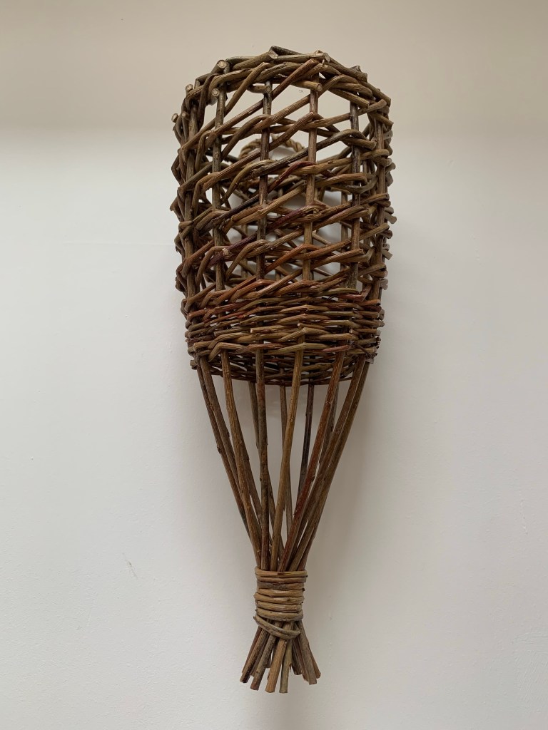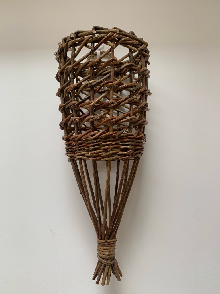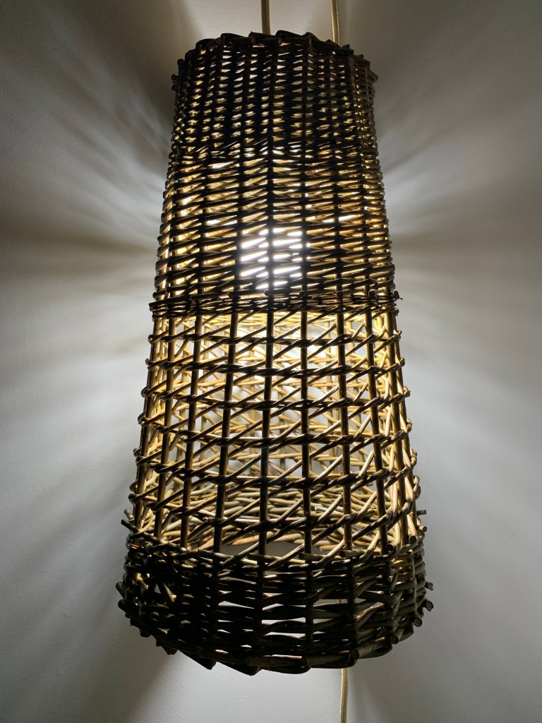 I think “shadow thrower” is probably a more appropriate name than lampshade, as the spacious graphic nature of the Irish weave used in traditional Donkey Creels, makes beautiful patterns on the walls. Woven in Cambridgeshire grown willows such as Brittany Green or Dickie Meadows. Height 41cm, Top Diameter 14cm, Base Diameter 24cm.