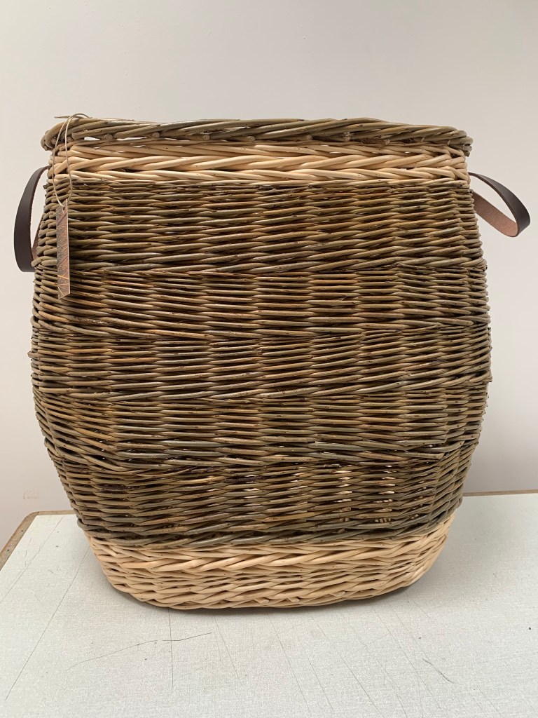 Oval Log Basket £100 Base dimensions 44cm x 34cm, Top dimensions 58cm x 45cm, Height 28cm, Height to top of handles 34cm. A large sturdy Log basket woven in Cambridgeshire and Somerset Willows. A traditionally English underfoot base with slewed side weaving.Ideal for logs, kindling, shoes and toy storage.