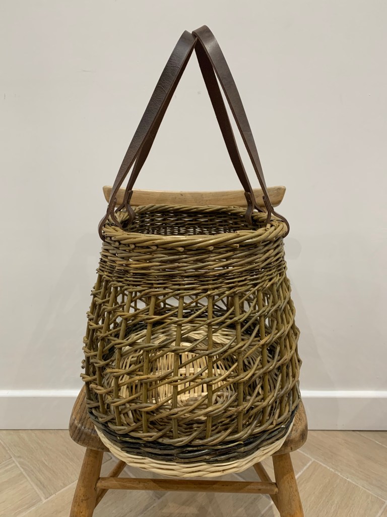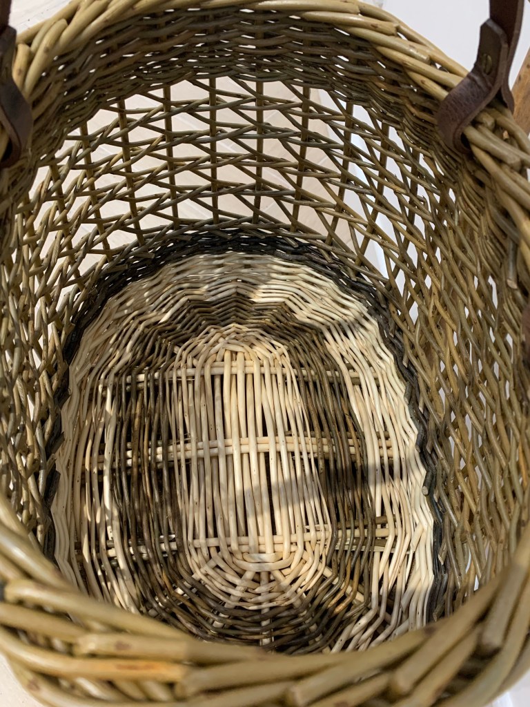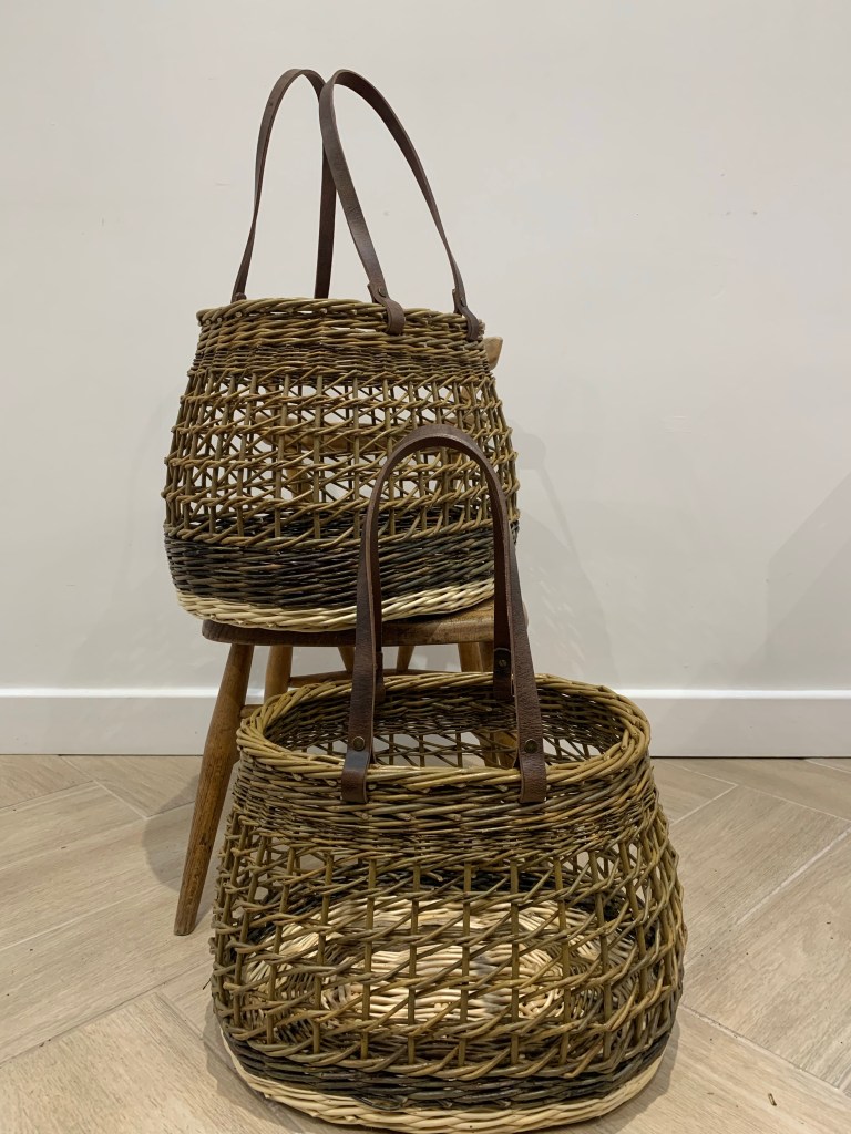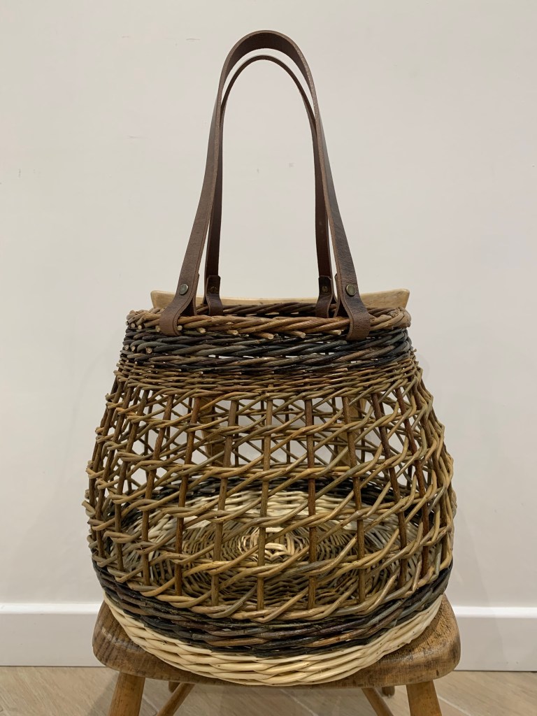 Such a beautiful and useful capacious shopping basket with leather handles that makes for comfortable carrying of weightier items like wine bottles. The graphic open nature of the Irish weave makes it a light basket that is very strong. Woven in combinations of Somerset white willows and Cambridgeshire home grown willows such as Dickie Meadows and Brittany Green.