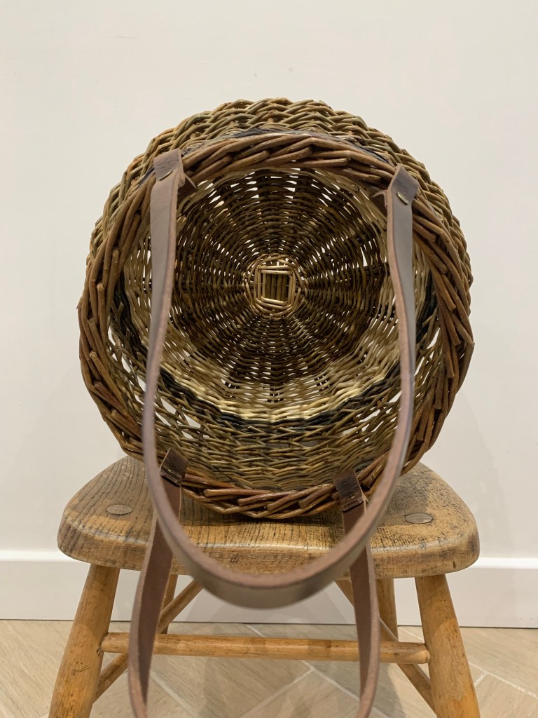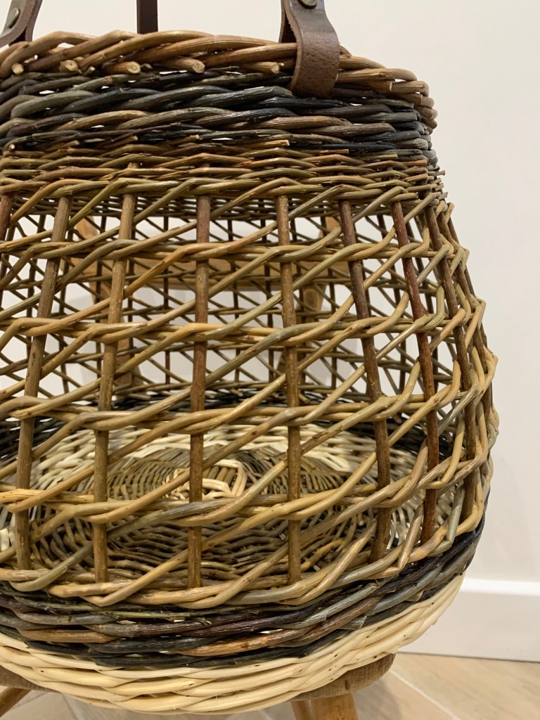 “Pumpkin” Log Basket £70, £80, £100 Small- Diameter 22cm-35cm,Height 27cm, Height to handle 32cm. Medium- Diameter 25cm-45cm, Height 32cm, Height to handle 38cm. Large- Diameter 30cm-55cm, Height 35cm, Height to handle 40cm. Woven mainly in Cambridgeshire grown willows with Somerset grown stripped White or Buff willows as a contrast.A continental split stick base with an English rand side weave. Very light, strong and useful for carrying and storing logs, kindling, shoes and toys. So named for it’s curvy, ergonomic profile.