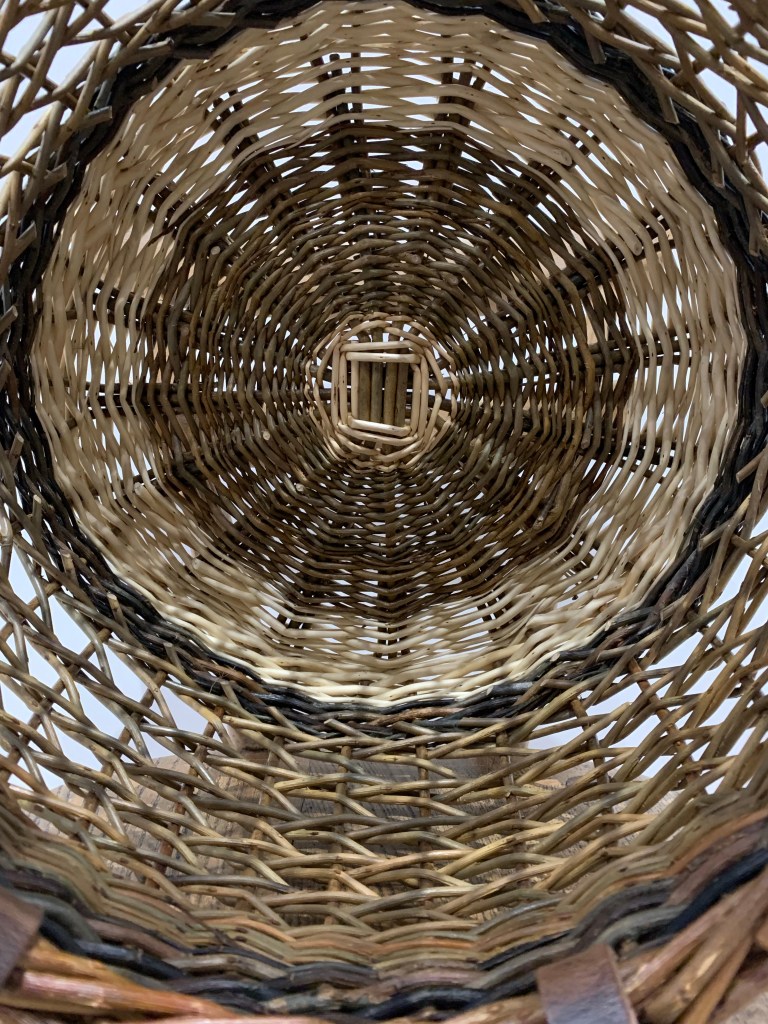 The round version of the Modern Shopper using the traditional English base woven by holding the base sticks beneath the feet as the weavers are tied about them. Robust in function but delicate in appearance because of the open Irish weave. Woven in combinations of white and bark on willows with leather handles and brass screw rivets.