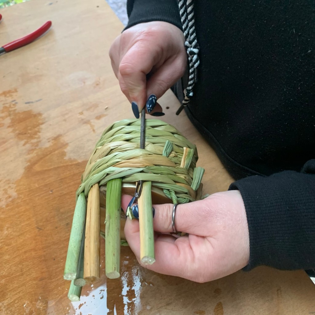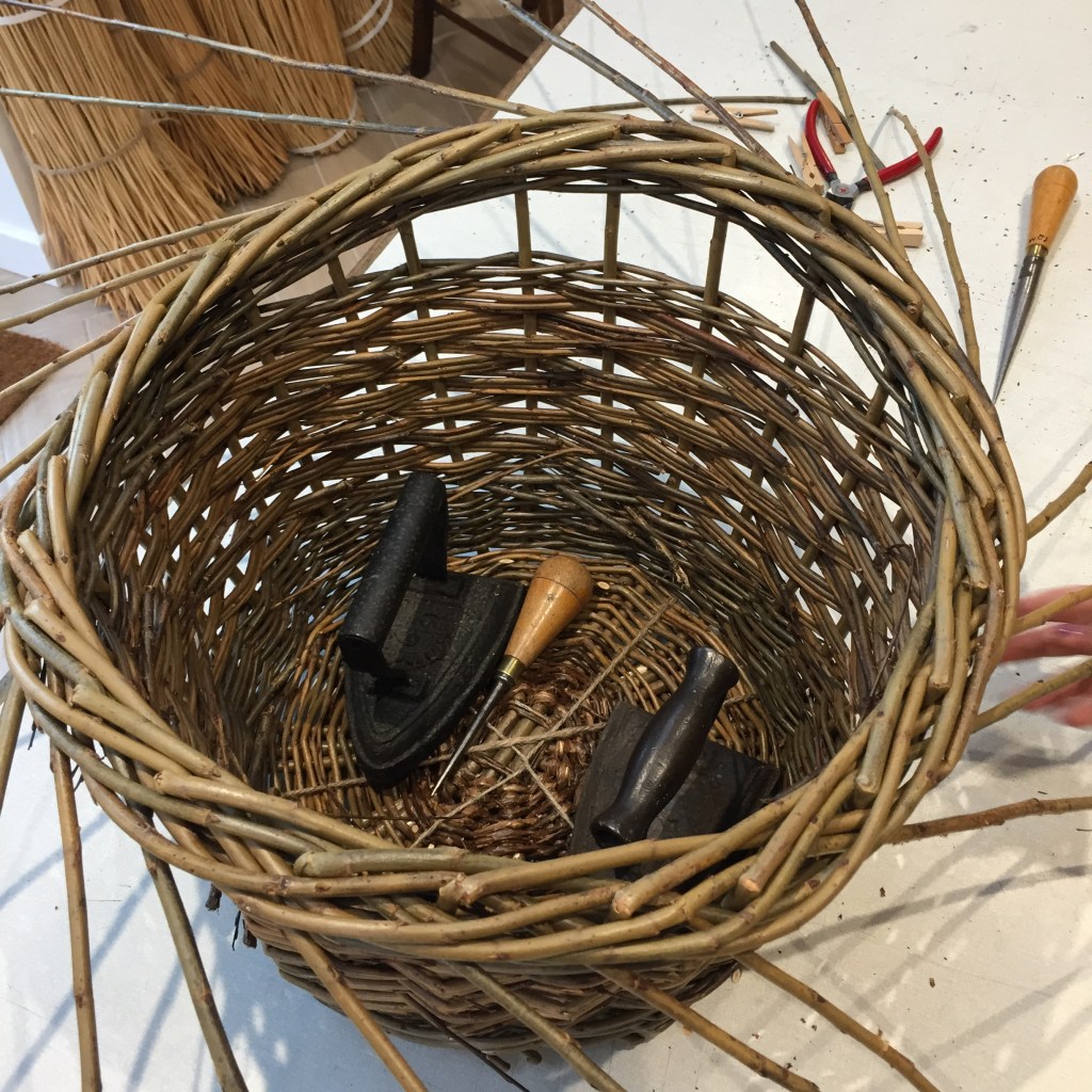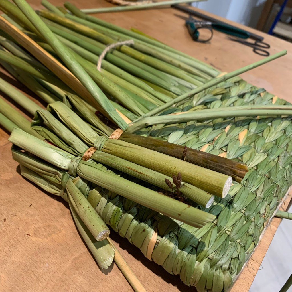 The materials themselves can be up to 2-3 metres long and present as trip hazards so careful, respectful and considerate handling of willow and rush is really important. Even short off cuts of willow make for a rolling hazard if stood upon so working in an organised manner keeping off cuts in buckets or baskets is very sensible. I know this from experience and have unintentionally roller skated onto my backside, so for warned is for armed!