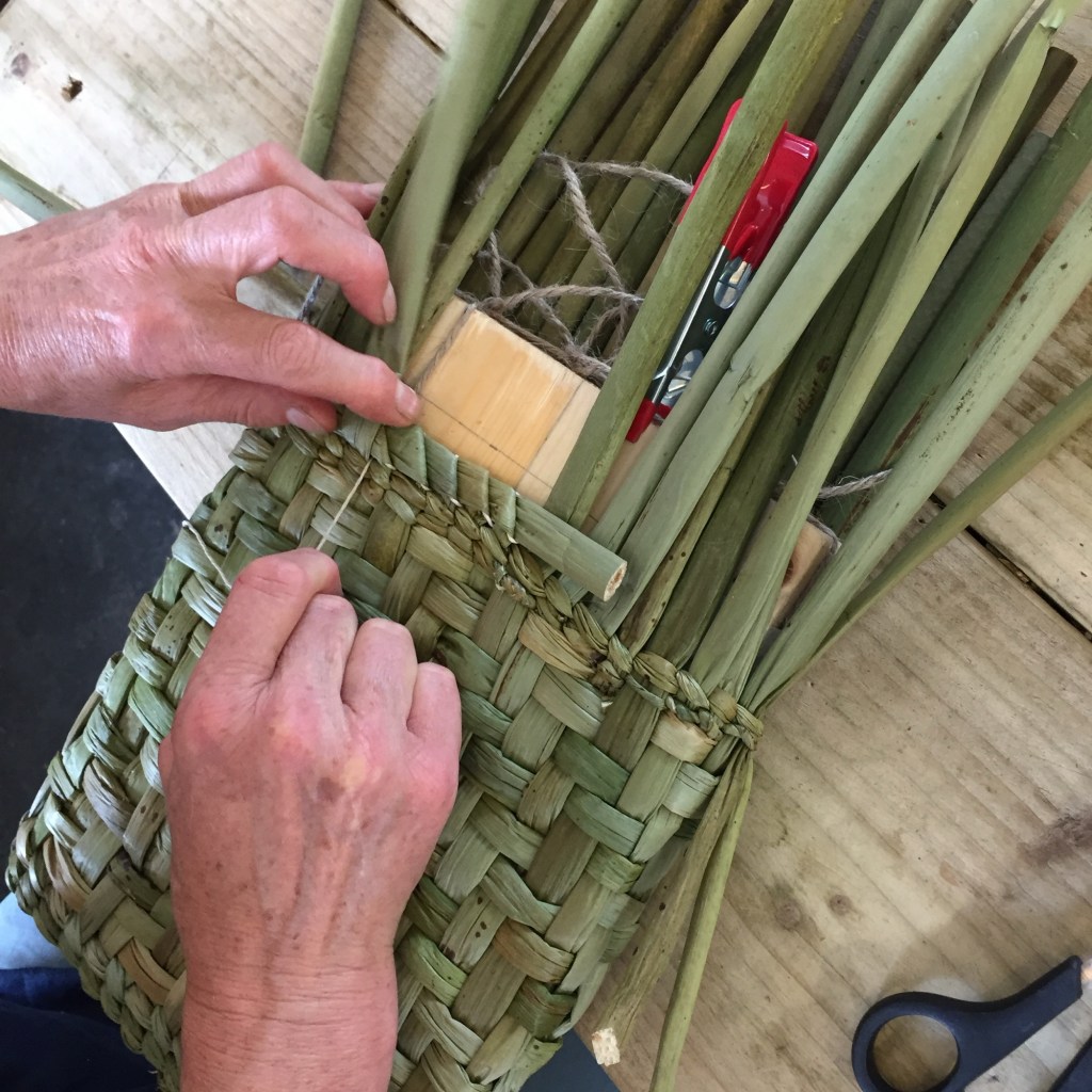 Because the materials being woven in workshops is usually a natural plant they may need a little wiping over before use, especially where the Rush is concerned. It grows in flowing water and likes to grow in the reed swamp margins of a waterway. This means it can be silty at the thicker butt ends and so wearing old clothes or coveralls or aprons is encouraged. On very rare occasions participants may react to the mould spores on the Rush because it grows in water. If you have allergies such as hay fever or are asthmatic bring antihistamines and inhalers in case you have a reaction. The regular washing of hands and avoiding touching your face is encouraged to reduce the likelihood of a reaction.
