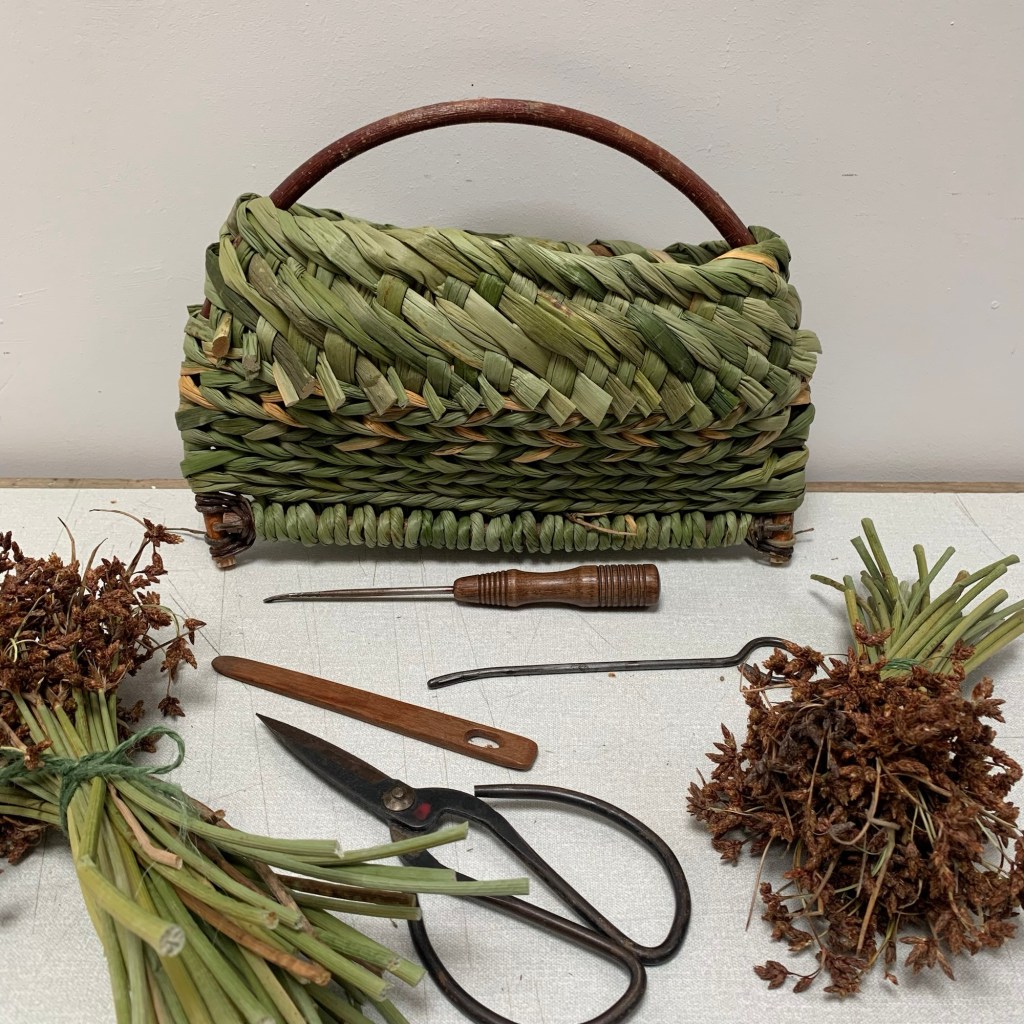 For Autumn School 2026 dive into the rush world of Fen dwellers of the 1800’s and plait yourself a Docky Bag. Long lengths of 7 end plait are stitched together with a mattress stitch that hides the hemp cord and pulls the two edges of plait into one another. Starting at the base then spiralling up to the top rim, making a lid from two other lengths of plait stitched about one another.Finally stitching leather handles to the main body of the basket that thread through slots in the lid to make a historical basket very functional and appropriate for modern living. There is a very comprehensive handout that accompanies the teaching, a useful reference document if you wish to make more after the course.