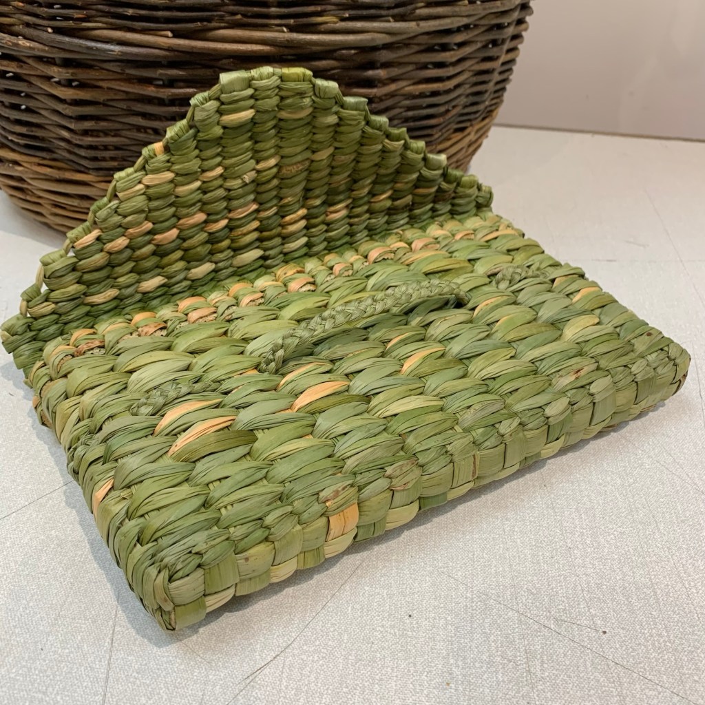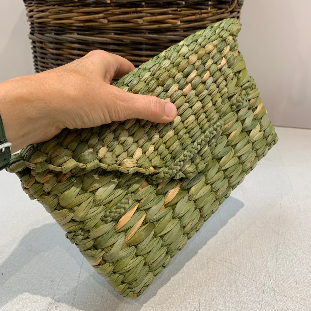 A small clutch basket made upon a mould with twining techniques to give a textured finish. The envelope lid that folds over to sit beneath a fine plait means you will grasp how to turn on various stakes to shape the triangle. There will be other leaves available to add another texture and colour contrasting beautifully with the rush.
